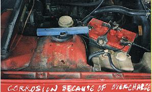 An overcharging battery spurts electrolyte all over and corrodes the bodywork. The blue gadget in the center of the picture was used to cover the caps to prevent acid from spurting upwards but the acid went sideways!